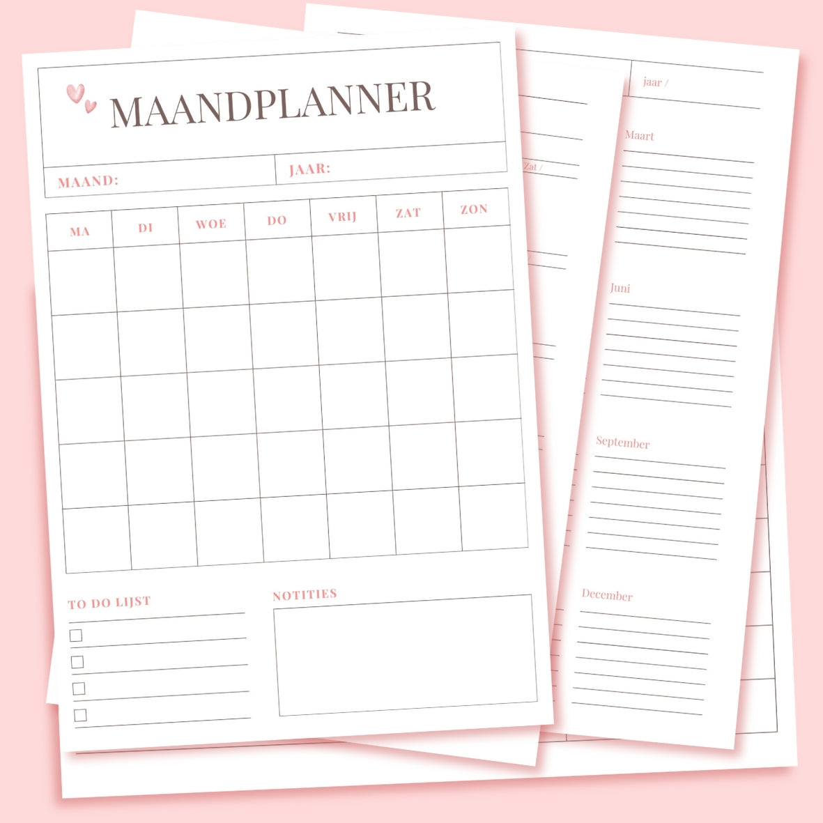 Na aankoop ontvang je een digitale download (PDF) met 4 verschillende maandpagina’s, zodat je kunt kiezen wat bij jouw manier van plannen past: